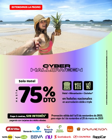 Del 01 al 05 de noviembre de 2025, disfruta el CYBER HALLOWEEN On Vacation con descuentos imperdibles en los mejores hoteles de Colombia. Viaja hasta junio de 2026, con tarifas desde %75 de descuento por persona.