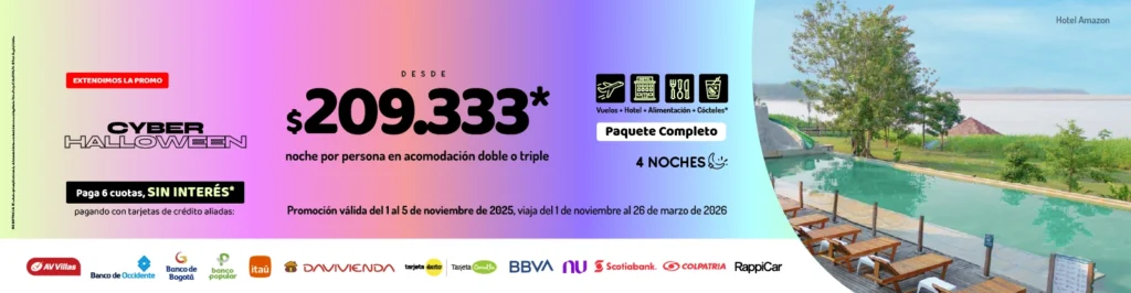 Del 01 al 05 de noviembre de 2025, disfruta el CYBER HALLOWEEN On Vacation con descuentos imperdibles en los mejores hoteles de Colombia. Viaja hasta junio de 2026, con tarifas desde %75 de descuento por persona.