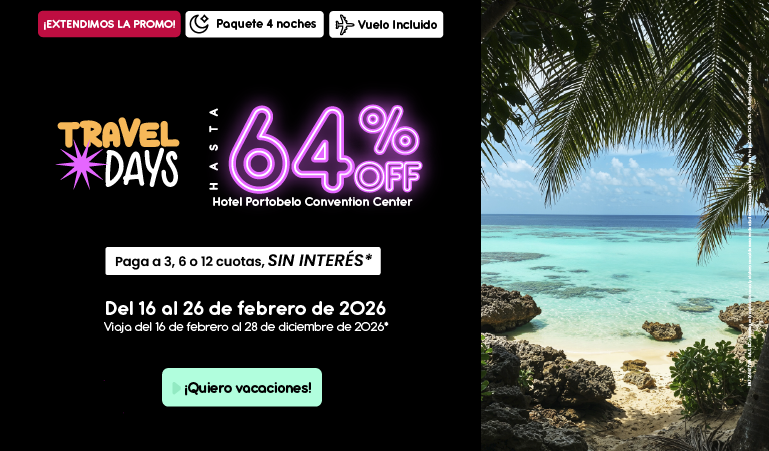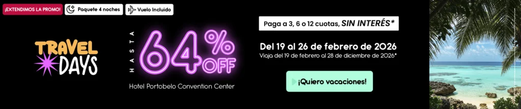 Descubre las mejores ofertas en hoteles durante los Travel Days, del 27 de Febrero al 2 de Marzo de 2026, con hasta 67% OFF en el Bloque Caribe y pago a 3, 6 o 12 cuotas sin interés. Reserva solo hotel y viaja entre el 12 de febrero y el 28 de diciembre de 2026. También podrás aprovechar la Preventa Exclusiva Semana Santa, válida para viajar del 27 de marzo al 2 de abril de 2026, con descuentos especiales en destinos seleccionados.