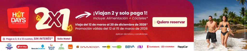 Viaja 5 días, 4 noches con desayuno, almuerzo y cena incluidos + 5 tipos de cocteles ilimitados del bar sunset. Tarifa válida por 2 personas en acomodación doble, triple, cuádruple. • Promoción vigente del 5 al 10 de diciembre de 2025. • Viaja YA y Paga después a 6 cuotas SIN INTERÉS con tarjeta de crédito de bancos aliados de Mercado Pago, reserva mínima de $1.000.000 • Plan de alimentación en el Hotel: Desayuno, almuerzo, cena, 5 tipos de cocteles ilimitados del bar sunset. (Sujeto a horarios), SI Incluye: Equipaje Bodega, Equipaje Cabina 10 Kg **Equipaje Cabina 10 Kg: Para las aerolíneas Wingo y JetSmart no aplica equipaje Cabina. Tarifas sujetas a disponibilidad aérea y hotelera. Aplican condiciones y restricciones. • RNT. 26847 TVHA S.A.S. BIC advierte que la explotación sexual y el abuso sexual de menores de edad es sancionado legalmente • Oficina Principal Calle 100 No. 7A – 81 · Piso 6 • Bogotá, Colombia. Leer más...