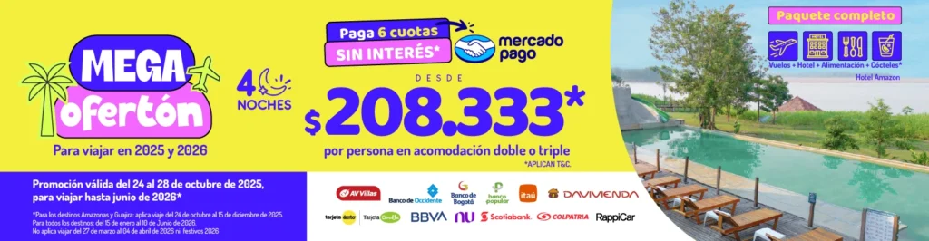 Reserva ahora: 2 noches con desayuno, almuerzo y cena incluidos + 5 tipos de cocteles ilimitados del bar sunset para 2 personas. • Viaja YA y Paga después a 3 cuotas SIN INTERÉS con tarjeta de crédito de bancos aliados de Mercado Pago, reserva mínima de $500.000. • Promoción válida del 24 al 28 de octubre de 2025. • Promoción en hoteles nacionales para viajar entre el 24 octubre de 2025 a junio de 2026. No aplica del 20 de diciembre de 2025 a 19 de enero de 2026, ni semana santa 2026, ni festivos. 2026. • Aplica sólo para venta de alojamiento página web • Sujeto a disponibilidad hotelera • Aplican términos y condiciones. Leer más...