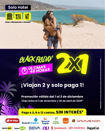 Solo del 1 al 2 de diciembre de 2025 vive los BLACK FRIDAY On Vacation y disfruta de noches de hotel con alimentación incluida (desayuno, almuerzo y cena con cocteles incluidos*) Paga a 3, 6 o 12 cuotas sin interés y viaja del 1 de diciembre de 2025 al 30 de abril de 2026. *No aplica para viajar en Semana Santa 2026 ni festivos.